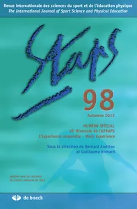 Volume 33 - Automne 2012 VIe Biennale de l'AFRAPS - L’Expérience corporellen°98, 2012/4 - pagesPages 5 à 5Le mot du directeurPar Jacques GleysePages 7 à 22Quelle expérience corporelle en STAPS ?Par Bernard Andrieu, Guillaume RichardPages 23 à 38Objets sportifs et corps sensibles : entre cultures matérielles et expériences corporellesPar Marie Level, Thierry LesagePages 39 à 48Conscience corporelle et apprentissage. Approche phénoménologique de l'expérience du performeurPar Raluca MocanPages 49 à 65Expérience corporelle et sens du mouvement : matérialisation via l'actimétrie du « contexte altéré par l'action » dans l'évolution du joueur de badmintonPar Olivier DieuPages 67 à 79La mise en scène corporelle de l'enseignant d'EPS : les communications non verbales au service de l'efficacité de l'enseignantPar Magali Boizumault, Geneviève CogérinoPages 81 à 94Le caractère fictionnel des connaissances d'intervention des entraîneurs en gymnastique artistiquePar Cathy Rolland, Marc CizeronPages 95 à 111La médiation audio-visuelle pour former à l'expérience corporelle de l'enseignant d'EPS en situation de classePar Lionel Roche, Nathalie Gal-PetitfauxPages 113 à 125S'entraîner à une virtuosité du sentir. Le cas des activités physiques et artistiquesPar Agathe DumontPages 127 à 142L'expérience sportive du corps en situation de handicap : vers une phénoménologie du fauteuil roulantPar Rémi RichardPages 143 à 156L'appropriation du judo : d'une « voie de la souplesse » à l'efficience incarnéePar Michaël HilpronPages 157 à 15910 ans de Sciences du Sport et d'Éducation Physique à l'ENS CachanPar Jacques Prioux